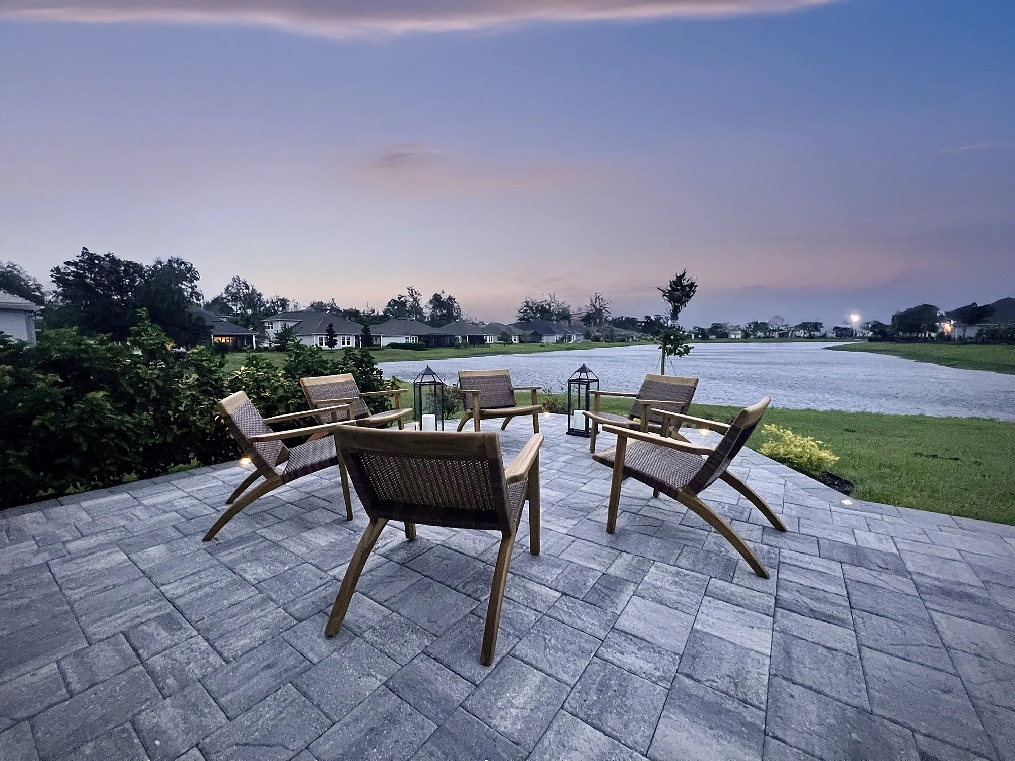 For this custom outdoor living project, I designed a one-of-a-kind patio that delivers a true geometric wow factor. The layout features two built-out octagons extending from the left and right-hand corners of the lanai, creating a dynamic visual symmetry that sets the entire space apart. Between the octagons, a full-length recessed step draws the eye inward, illuminated by sleek step lighting that enhances both function and ambiance while beautifully framing the entrance.